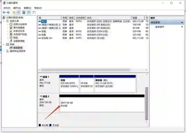 之后可以在计算机管理中看到最新挂载的硬盘了,之前分配的 2T 容量可以在这里像设置本地磁盘一样设置。