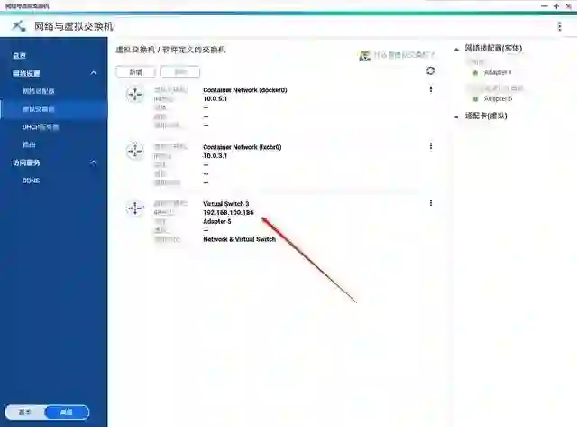 设置好之后可以看到就多了一个虚拟交换机了,这里可以设置与你 PC 或者其他设备同一个 IP 地址,之后就可以在网络邻居中之间访问这个 NAS 了。