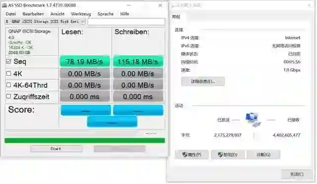 挂载好之后就可以用硬盘测速软件对于挂载的 iSCSI 硬盘进行测速,在千兆网络下读写速度和一般台式机 HDD 读写类似。