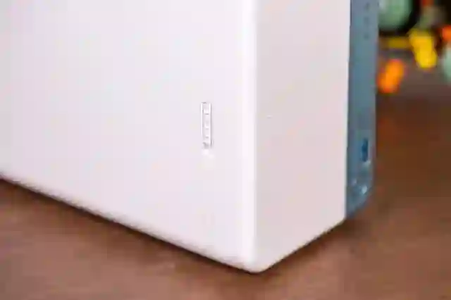 正面可以看到在硬盘仓前面还有一个全封闭的盖子。这样的设计不知道是否会影响 NAS散热,但是倒是可以很好的保证 NAS 内的灰尘不会太多,估计大家用过 NAS 的话都会对硬盘仓到处都是灰尘印象深刻。