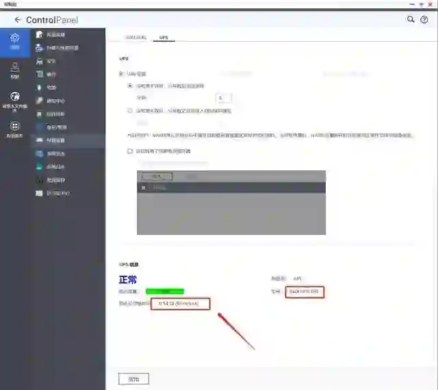 另外在控制台的外置设备下 UPS 中可以看到电源管理计划,以及 UPS 会能给你提供多长的关机续航,这样可以最大程度避免突然断电导致的硬盘损坏和数据损失。