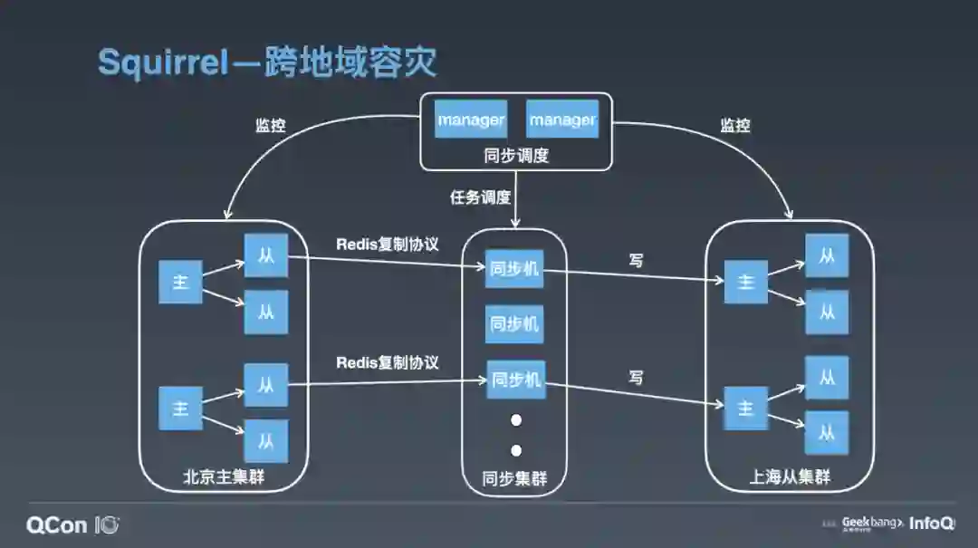 如上图,我画了北京的主集群以及上海的从集群,我们要做的是通过集群同步服务,把北京主集群的数据同步到上海从集群上。按照流程,首先要向我们的同步调度模块下发在两个集群间建立同步链路的任务,同步调度模块会根据主从集群的拓扑结构,把主从集群间的同步任务下发到同步集群,同步集群收到同步任务后会扮成 Redis 的 Slave,通过 Redis 的复制协议,从主集群上的从库拉取数据,包括 RDB 以及后续的增量变更。同步机收到数据后会把它转成客户端的写命令,写到上海从集群的主节点里。通过这样的方式,我们把北京主集群的数据同步到了上海的从集群。同样的,我们要做异地多活也很简单,再加一个反向的同步链路,就可以实现集群间的双向同步。