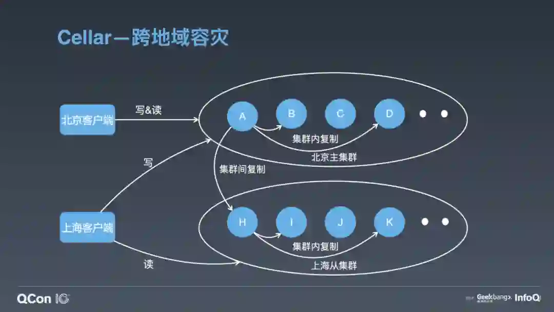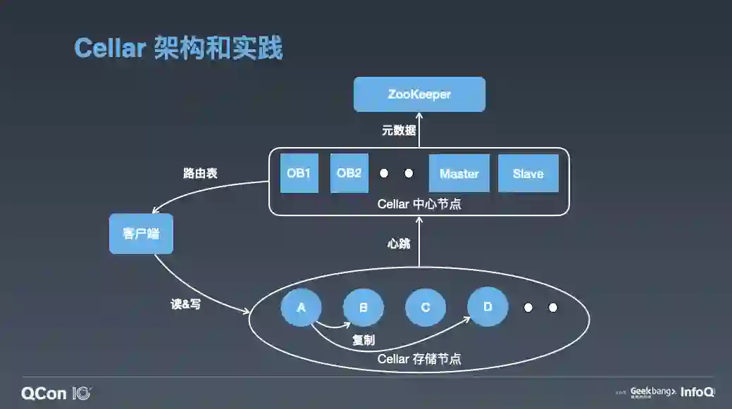 跟阿里开源的 Tair 主要有两个架构上的不同。第一个是 OB,第二个是 ZooKeeper。我们的 OB 跟 ZooKeeper 的 Observer 是类似的作用,提供 Cellar 中心节点元数据的查询服务。它可以实时与中心节点的 Master 同步最新的路由表,客户端的路由表都是从 OB 去拿。这样做的好处主要有两点,第一,把大量的业务客户端跟集群的大脑 Master 做了天然的隔离,防止路由表请求影响集群的管理。第二,因为 OB 只供路由表查询,不参与集群的管理,所以它可以水平扩展,极大地提升了我们路由表的查询能力。另外,我们引入了 ZooKeeper 做分布式仲裁,解决我刚才提到的 Master、Slave 在网络分割情况下的脑裂问题。并且通过把集群的元数据存储到 ZooKeeper,我们保证了元数据的高可靠。