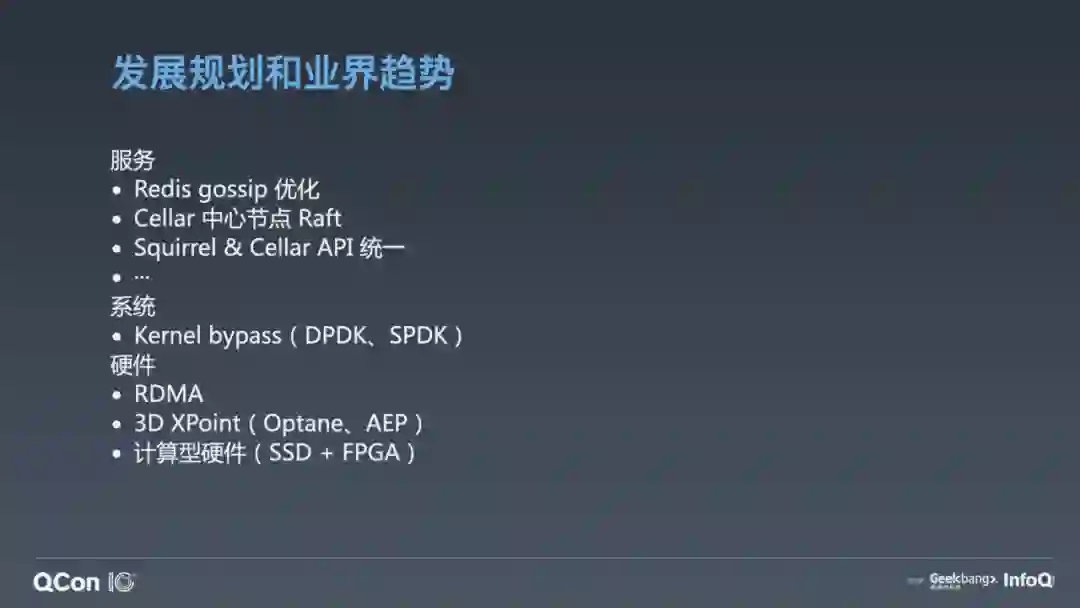 系统层面,我们正在调研并去落地一些 Kernel Bypass 技术,像 DPDK、SPDK 这种网络和硬盘的用户态 IO 技术。它可以绕过内核,通过轮询机制访问这些设备,可以极大提升系统的 IO 能力。存储作为 IO 密集型服务,性能会获得大幅提升。