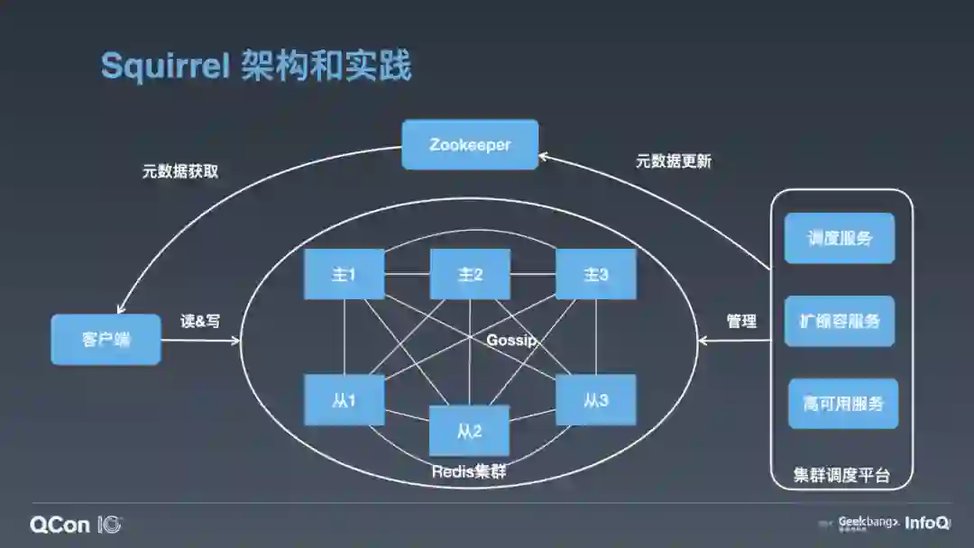 上图就是我们的 Squirrel 架构。中间部分跟 Redis 官方集群是一样的。它有主从的结构, Redis 实例之间通过 Gossip 协议通信。我们在右边添加了一个集群调度平台,包含调度服务、扩缩容服务和高可用服务等,它会去管理整个集群,把管理结果作为元数据更新到 ZooKeeper。我们的客户端会订阅 ZooKeeper 上的元数据变更,实时获取集群的拓扑状态,直接去 Redis 集群进行读写操作。