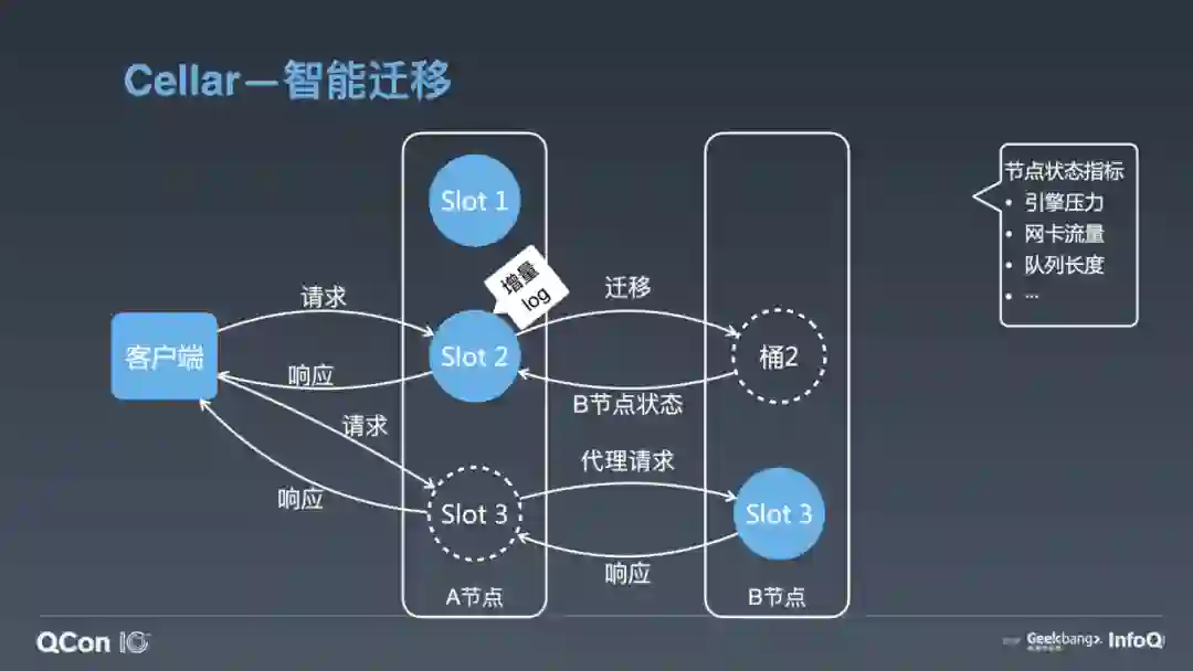 上图是 Cellar 智能迁移架构图。我把桶的迁移分成了三个状态。第一个状态就是正常的状态,没有任何迁移。如果这时候要把 Slot 2 从 A 节点迁移到 B 节点,A 会给 Slot 2 打一个快照,然后把这个快照全量发到 B 节点上。在迁移数据的时候, B 节点的回包会带回 B 节点的状态。B 的状态包括什么?引擎的压力、网卡流量、队列长度等。A 节点会根据 B 节点的状态调整自己的迁移速度。像 Squirrel 一样,它经过一段时间调整后,迁移速度会达到一个动态平衡,达到最快速的迁移,同时又尽可能小的影响业务的正常请求。