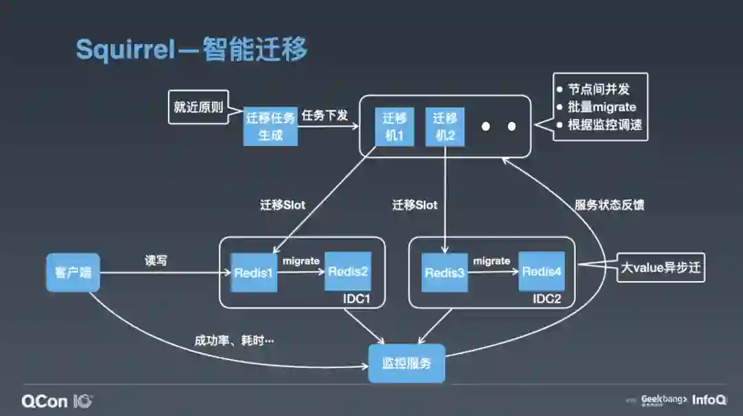 第一,我们会在集群内迁出节点间做并发,比如同时给 Redis 1、Redis 3 下发迁移命令;第二,每个 Migrate 命令会迁移一批 Key;第三,我们会用监控服务去实时采集客户端的成功率、耗时,服务端的负载、QPS 等,之后把这个状态反馈到迁移机上。迁移数据的过程就类似 TCP 慢启动的过程,它会把速度一直往上加,若出现请求成功率下降等情况,它的速度就会降低,最终迁移速度会在动态平衡中稳定下来,这样我们就达到了最快速的迁移,同时又尽可能小地影响业务的正常请求。