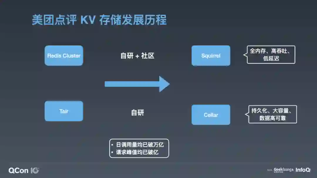 这两个存储其实是 KV 存储领域的不同解决方案。实际应用上,如果业务的数据量小,对延迟敏感,建议用 Squirrel ;如果数据量大,对延迟不是特别敏感,我们建议用成本更低的 Cellar 。目前这两套 KV 存储系统在美团点评内部每天的调用量均已突破万亿,它们的请求峰值也都突破了每秒亿级。