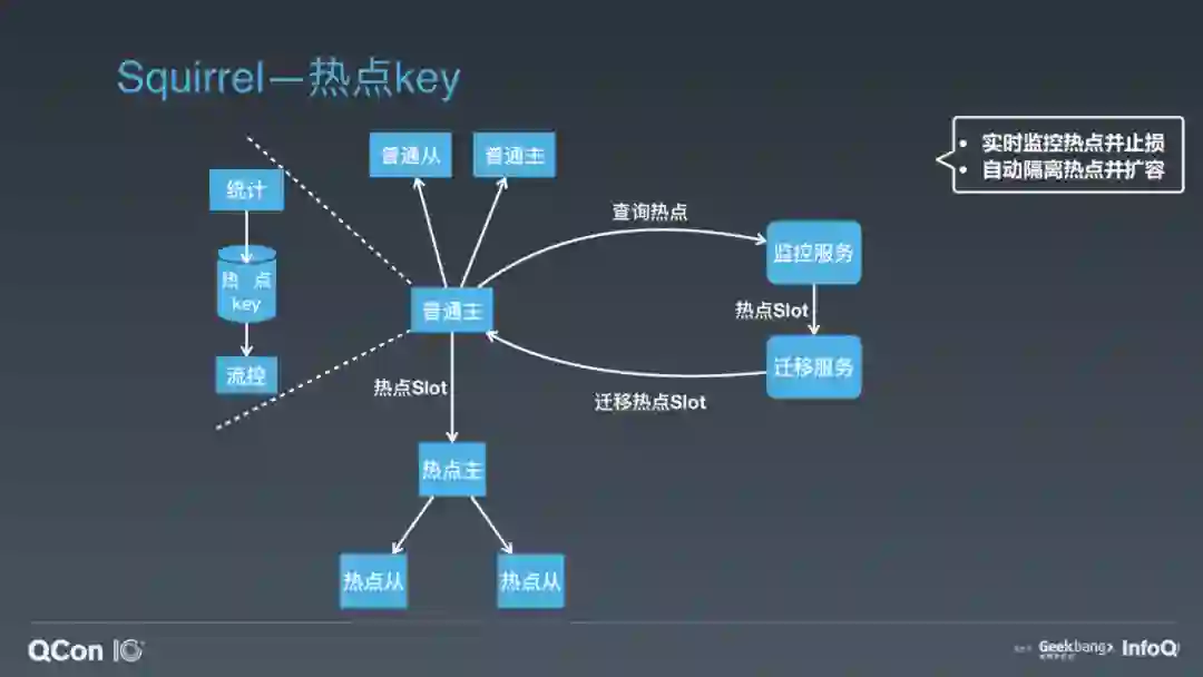 当有请求进来读写普通节点时,节点内会同时做请求 Key 的统计。如果某个 Key 达到了一定的访问量或者带宽的占用量,会自动触发流控以限制热点 Key 访问,防止节点被热点请求打满。同时,监控服务会周期性地去所有 Redis 实例上查询统计到的热点 Key。如果有热点,监控服务会把热点 Key 所在 Slot 上报到我们的迁移服务。迁移服务这时会把热点主从节点加入到这个集群中,然后把热点 Slot 迁移到这个热点主从上。因为热点主从上只有热点 Slot 的请求,所以热点 Key 的处理能力得到了大幅提升。通过这样的设计,我们可以做到实时的热点监控,并及时通过流控去止损;通过热点迁移,我们能做到自动的热点隔离和快速的容量扩充。