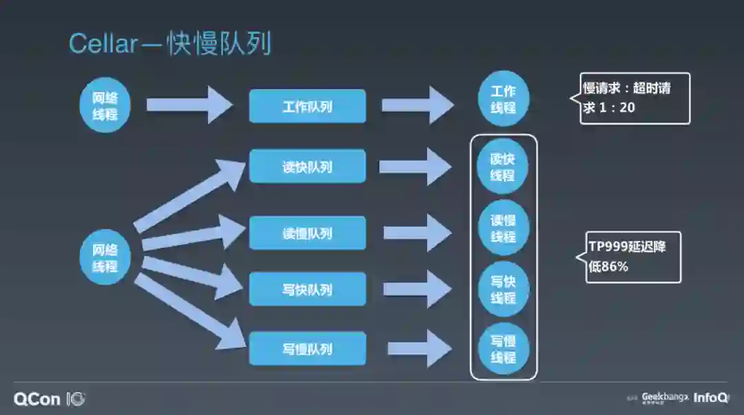 我们的解法是什么样?很简单,拆线程池、拆队列。我们的网络线程在收到包之后,会根据它的请求特点,是读还是写,快还是慢,分到四个队列里。读写请求比较好区分,但快慢怎么分开?我们会根据请求的 Key 个数、Value 大小、数据结构元素数等对请求进行快慢区分。然后用对应的四个工作线程池处理对应队列的请求,就实现了快慢读写请求的隔离。这样如果我有一个读的慢请求,不会影响另外三种请求的正常处理。不过这样也会带来一个问题,我们的线程池从一个变成四个,那线程数是不是变成原来的四倍?其实并不是的,我们某个线程池空闲的时候会去帮助其它的线程池处理请求,所以,我们线程池变成了四个,但是线程总数并没有变。我们线上验证中这样的设计能把服务 TP999 的延迟降低 86%,可大幅降低超时率。