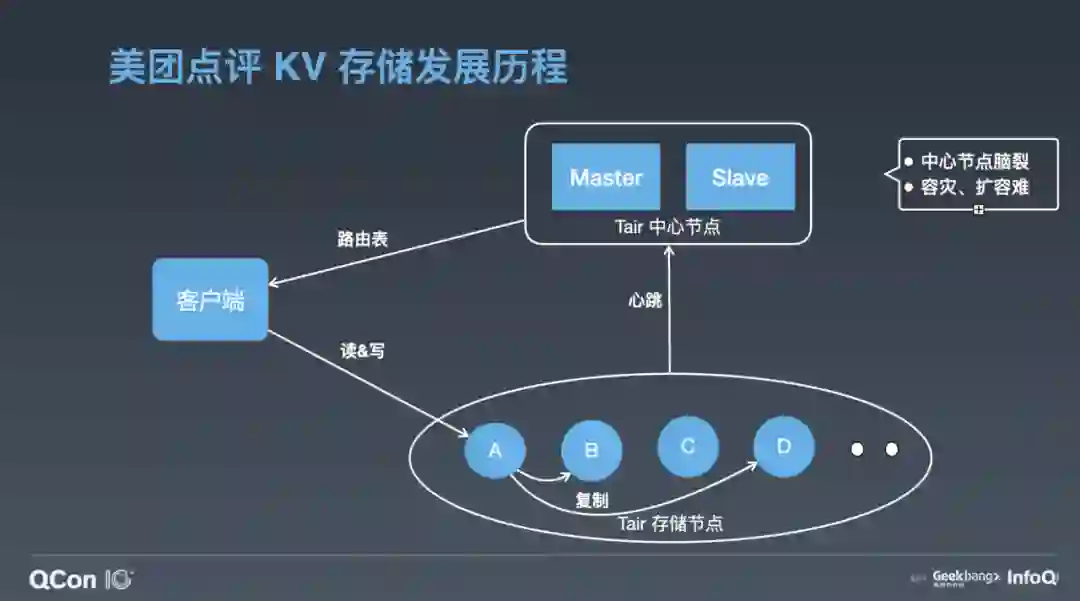 这个时候我们发现开源界有了一个比较成熟的 KV 存储:阿里 Tair 。2014 年,我们把 Tair 引入到公司,来满足业务 KV 存储方面的需求。Tair 开源版本的架构主要是三部分:上图下边是存储节点,存储节点会上报心跳到它的中心节点,中心节点内部有两个配置管理节点,会监控所有的存储节点,有任何存储节点宕机或者扩容之类,它会做集群拓扑的重新构建。客户端启动的时候,它会直接从中心节点拉来一个路由表,这个路由表简单来说就是一个集群的数据分布图,客户端根据路由表直接去存储节点读写。之前我们 KV 遇到的扩容丢数据问题,它也有数据迁移机制来保证数据的完整性。