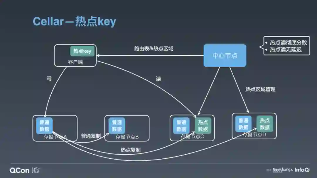 我们通过读写流程看一下这个方案是怎么运转的。如果客户端有一个写操作到了 A 节点,A 节点处理完成后,会根据实时的热点统计结果判断写入的 Key 是否为热点。如果这个 Key 是一个热点,那么它会在做集群内复制的同时,还会把这个数据复制有热点区域的节点,也就是图中的 C、D 节点。同时,存储节点在返回结果给客户端时,会告诉客户端,这个 Key 是热点,这时客户端内会缓存这个热点 Key。当客户端有这个 Key 的读请求时,它就会直接去热点区域做数据的读取。通过这样的方式,我们可以做到只对热点数据做扩容,不像 Squirrel ,要把整个 Slot 迁出来做扩容。有必要的话,中心节点也可以把热点区域放到集群的所有节点上,所有的热点读请求就能均衡的分到所有节点上。另外,通过这种实时的热点数据复制,我们很好地解决了类似客户端缓存热点 KV 方案造成的一致性问题。