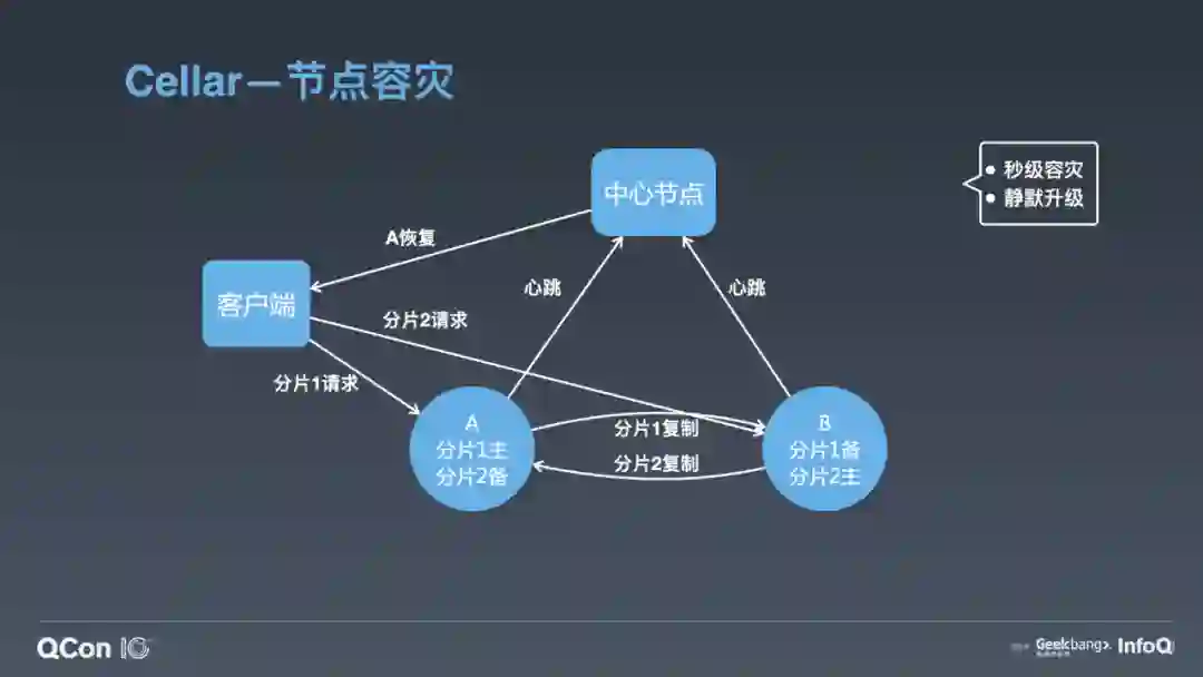 通过这样的操作,我们可以做到秒级的快速节点摘除,而且节点恢复后加回,只需补齐少量的增量数据。另外如果 A 节点要做升级,中心节点先通过主动 Handoff 把 A 节点流量切到 B 节点,A 升级后再回写增量 Log,然后切回流量加入集群。这样通过主动触发 Handoff 机制我们就实现了静默升级功能。