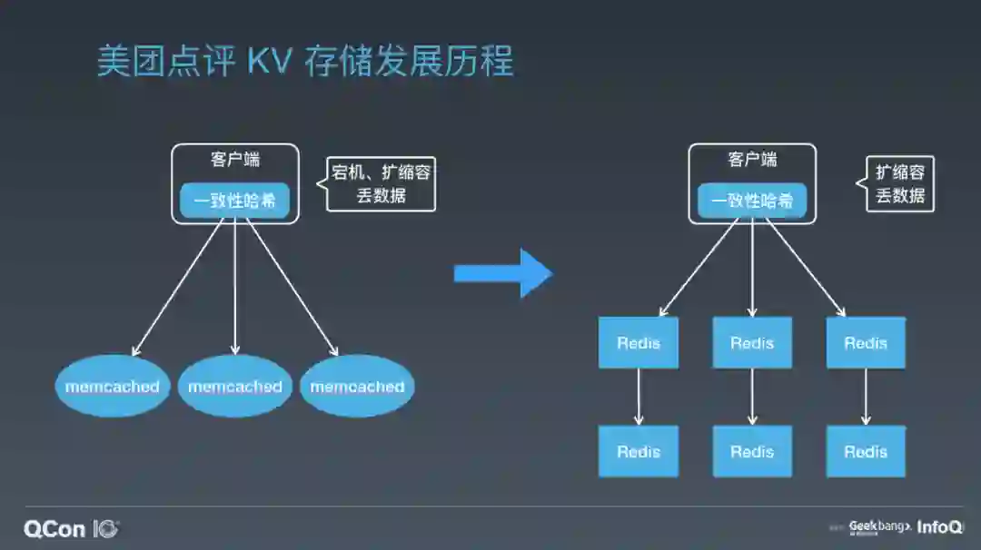 下面我们看第一部分。美团点评第一代的分布式 KV 存储就是下图左侧这个架构,应该很多公司都经历过这个阶段。在客户端内做一致性哈希,后端部署上很多 Memcached 实例,这样就实现了最基本的 KV 存储分布式设计。但这样的设计有很明显的问题:比如宕机摘除节点会丢数据;比如缓存空间不够需要扩容,一致性哈希也会丢一些数据,这样会给业务的开发带来很多困扰。