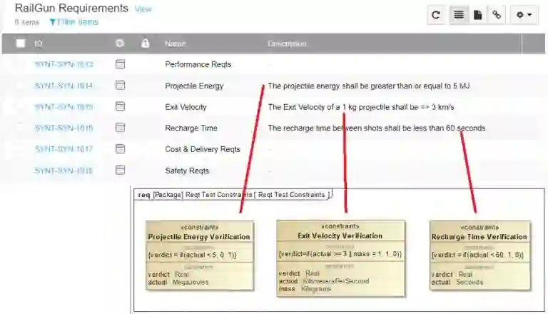 例如,图6中的Jama需求"炮弹能量应大于或等于5MJ",连接到SysML条件约束, "verdict = if(actual < 5, 0,1)",该约束返回两种结果: