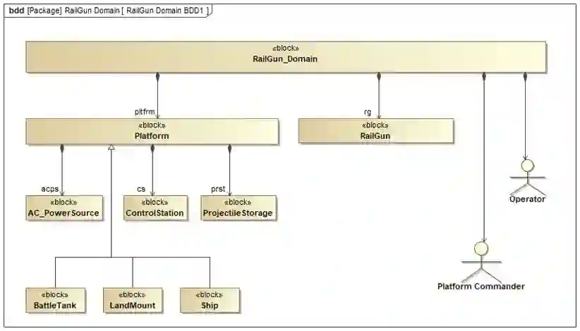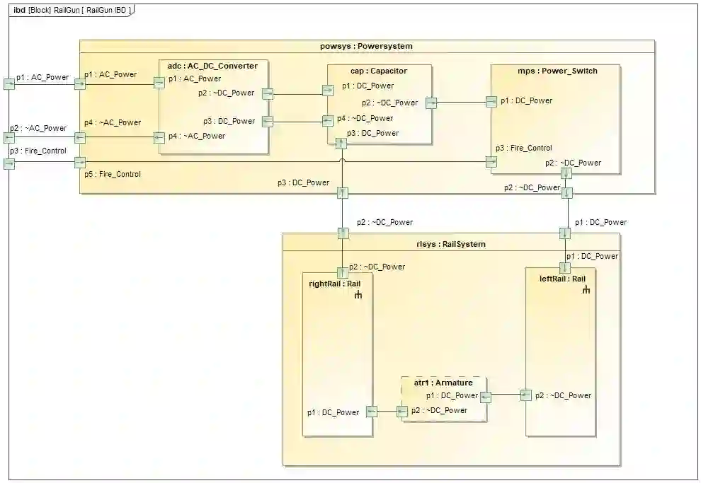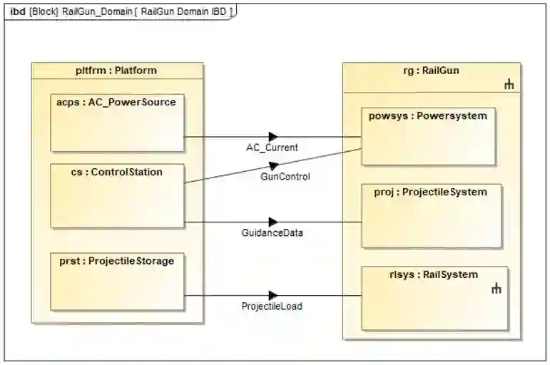 最后,我们需要考虑轨道炮需要的输入。用SysML IBD (内部块图)在非常抽象的级别概括如图5。Railgun需要从Platform获得: