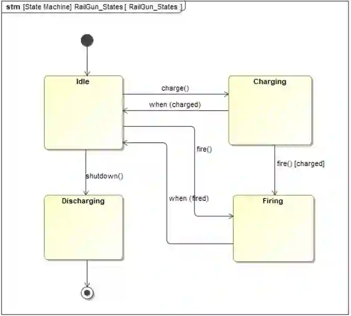 同样的周期由Railgun块的状态机图捕获如图4。在系统被关闭之前,进入Discharging(放电中)状态。注意图4是SOI的行为,而图3是整个领域的行为。不过,它们通过图3中Railgun生命线上的状态不变量符号链接起来,展示了操作场景不同阶段的轨道炮状态。