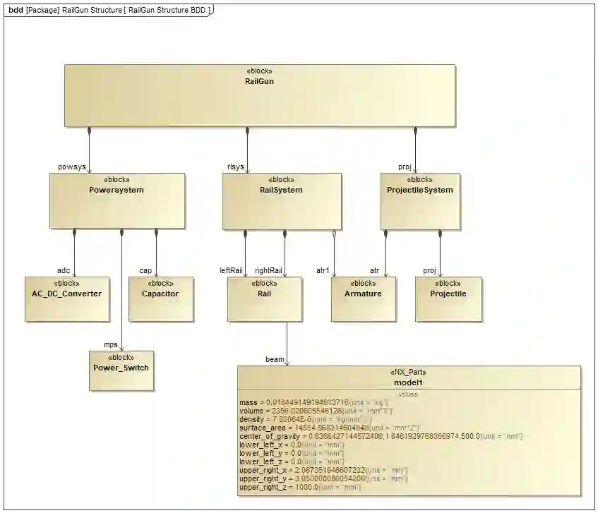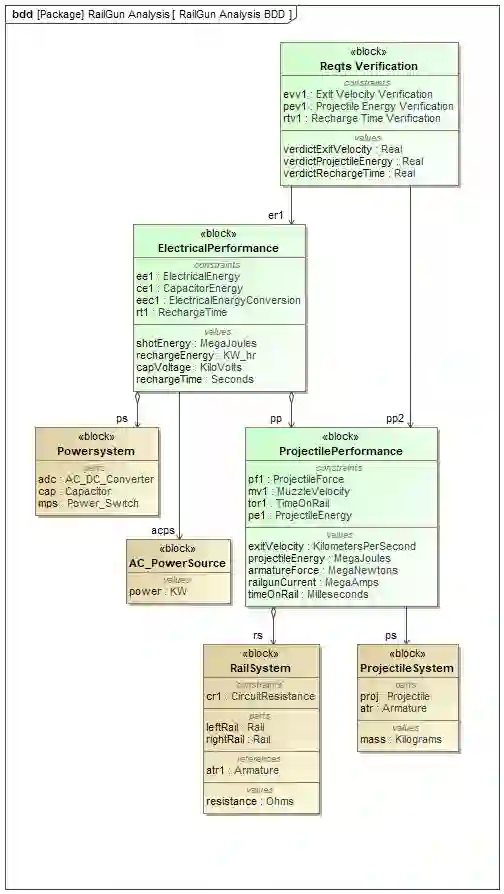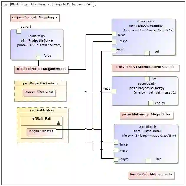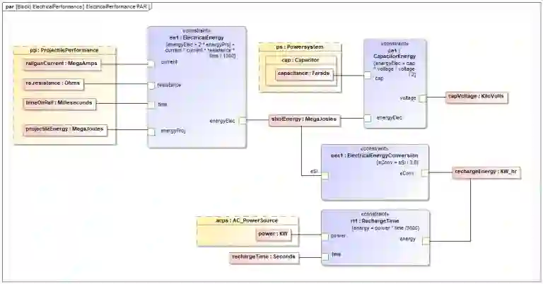 图10表达了内在分析的方法。使用较低保真度的近似捕获为SysML参数模型。灰色块代表系统组件或子系统,绿色块持有分析的约束公式。系统组件块持有组件的静态特征值,例如质量或电阻。在这个模型中,轨道长度来自CAD模型,通过参数连接和单位换算展示在同一图中。分析块持有约束以及分析的最终或中间值,例如炮弹能量或初速度,并引用组件块以获得静态值。