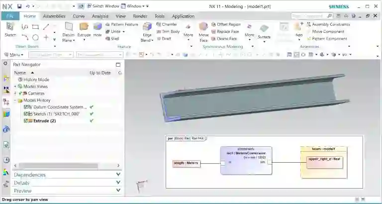 在设计流程,机械CAD将用于设计各个组件,包括关键的轨道。图9中,用NX设计了一个U型槽梁的3D CAD模型,它将作为轨道的代表。决定轨道炮性能的一个关键参数是轨道长度。