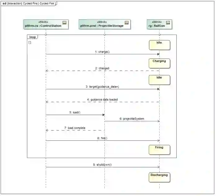 我们可以使用SysML的行为建模能力来捕获操作场景。图3是描述开火操作的序列图,通过控制站、轨道炮和弹仓之间的一系列事务达到。领域的所有部件在图2描述。轨道炮的一个特征是需要很短时间(几毫秒)内的大电流(兆安)。大电流由储能装置提供,例如电容。用持续的电源给电容慢慢充电,在开火时快速放电。这个充电-开火周期必须在操作场景中描述。