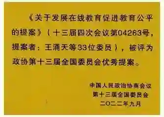 中国图象图形学学会副理事长、北京理工大学王涌天教授领衔提出的《关于发展在线教育促进教育公平的提案》被评选为政协第十三届全国委员会优秀提案。