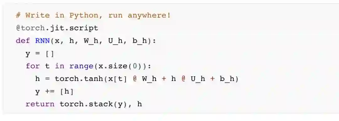 新增的torch.jit包,包含了一组编译器工具,用于搭建PyTorch的研究与工业生产之间的桥梁。它包括一种名为Torch Script的语言(单从语法上来看,这是Python语言的一个子集,所以我们不用再学一门新语言了),以及两种使现有代码与JIT兼容的方法。
