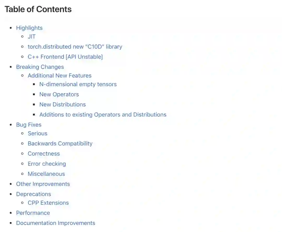 首先重磅更新:支持工业产品的JIT功能,以及基于新的C10D库的分布式训练功能torch.distributed, 还有为追求超高性能以及使用C++的同学们提供的C++前端(PyTorch C++类库)。