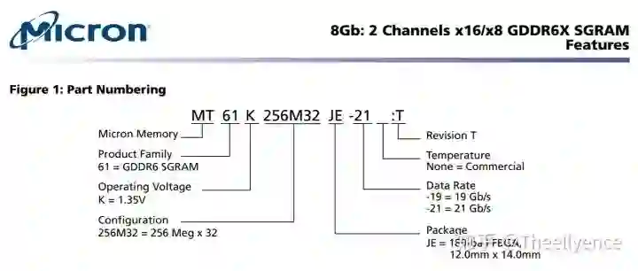 MT61K256M32JE-19 与 MT61K256M32JE-21,分别对应RTX3080与RTX3090的 D8BGW / D8BGX,前者传输速率为19Gb/s,后者则是21Gb/s。