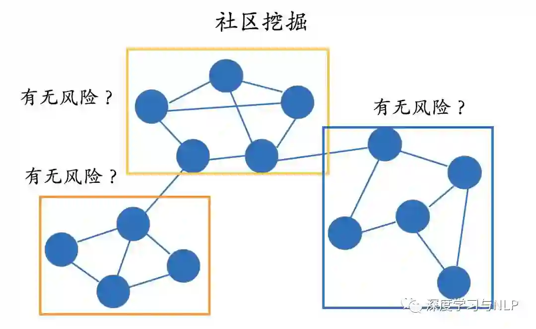 社区挖掘算法的目的在于从图中找出一些社区。对于社区,我们可以有多种定义,但直观上可以理解为社区内节点之间关系的密度要明显大于社区之间的关系密度。下面的图表示社区发现之后的结果,图中总共标记了三个不同的社区。一旦我们得到这些社区之后,就可以做进一步的风险分析。