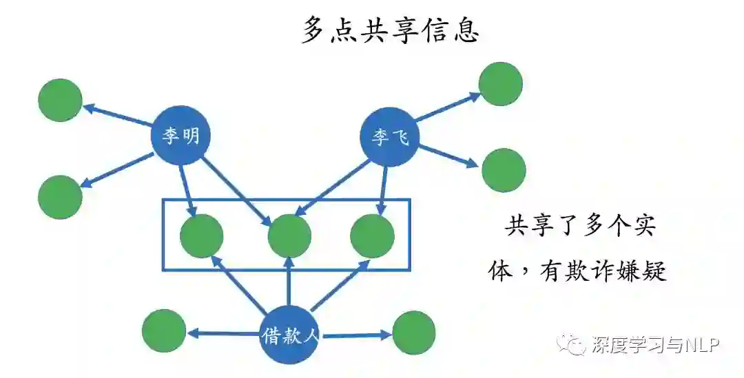 这种方法比较适用于找出团体欺诈,它的核心在于通过一些模式来找到有可能存在风险的团体或者子图(sub-graph),然后对这部分子图做进一步的分析。 这种模式有很多种,在这里举几个简单的例子。 比如在下图中,三个实体共享了很多其他的信息,我们可以看做是一个团体,并对其做进一步的分析。