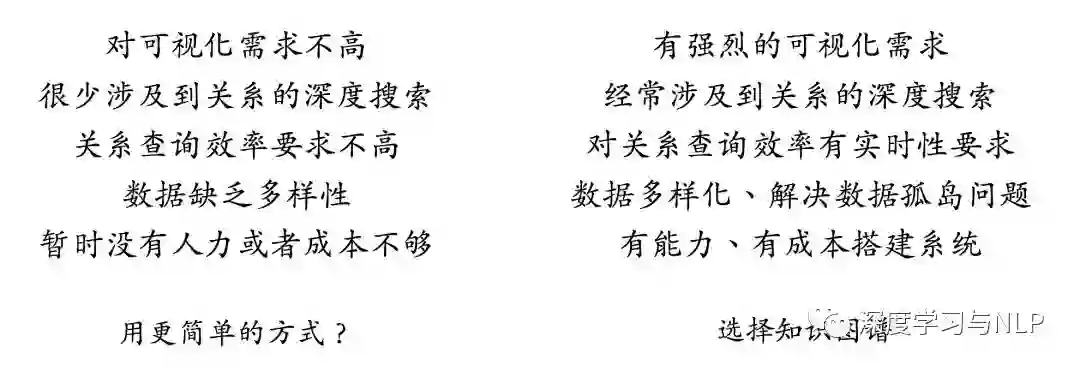 在进入下一个话题的讨论之前,要明确的一点是,对于自身的业务问题到底需不需要知识图谱系统的支持。因为在很多的实际场景,即使对关系的分析有一定的需求,实际上也可以利用传统数据库来完成分析的。所以为了避免使用知识图谱而选择知识图谱,以及更好的技术选型,以下给出了几点总结,供参考。