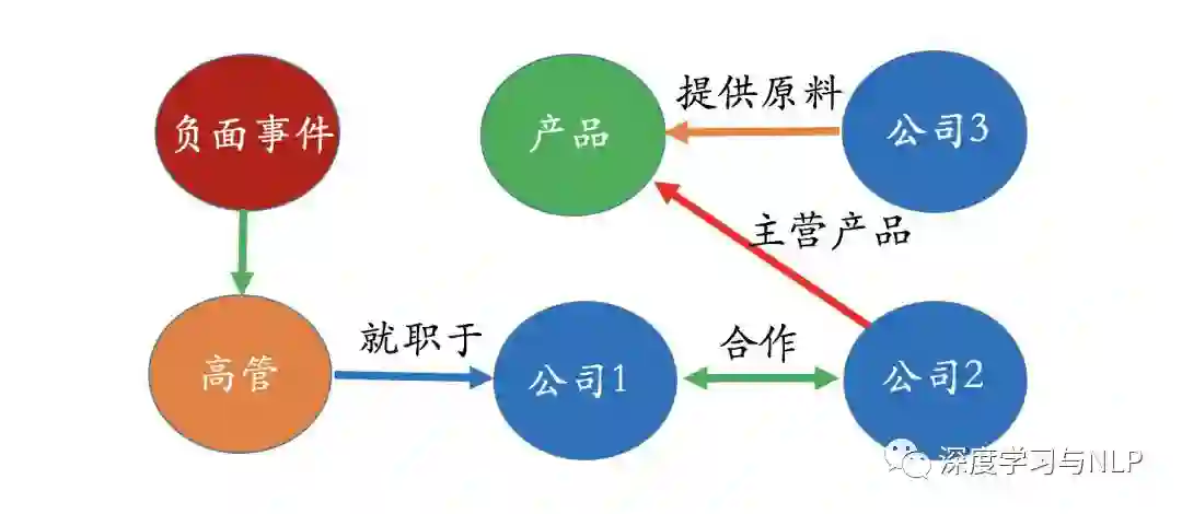 在证券领域,我们经常会关心比如“一个事件发生了,对哪些公司产生什么样的影响?” 比如有一个负面消息是关于公司1的高管,而且我们知道公司1和公司2有种很密切的合作关系,公司2有个主营产品是由公司3提供的原料基础上做出来的。