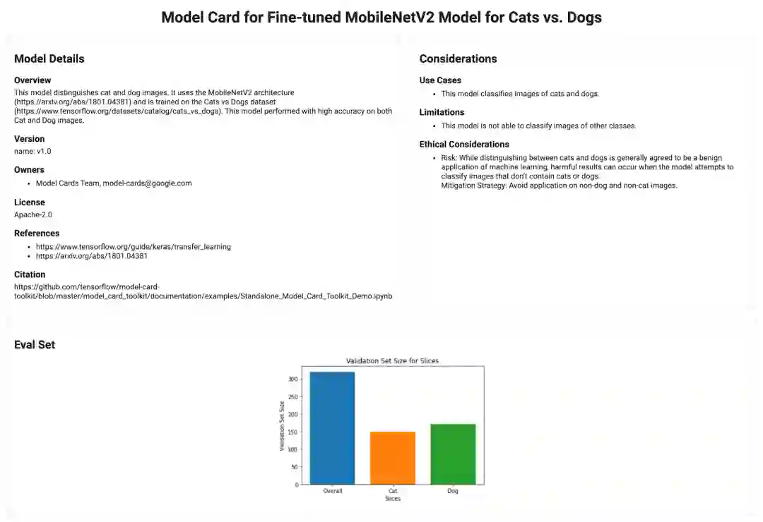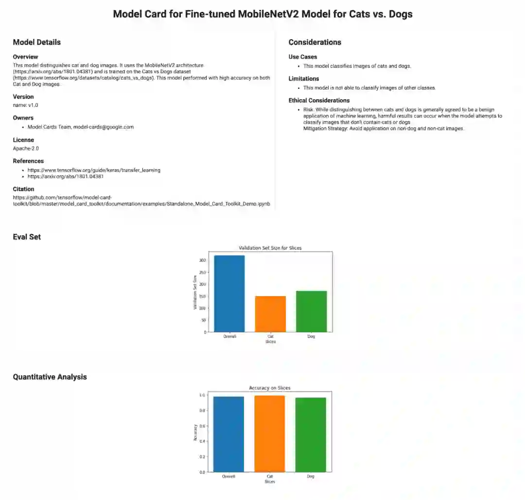 我们对该工具包的设计初衷是采用模块化风格,这样一来,即使 Model Card 创建者的建模环境未与 MLMD 集成,仍可以利用 JSON 架构和 ModelCard 数据 API。在本文中,我们将向您展示如何使用这些组件来为由 Keras 构建、在 ImageNet 上训练并在 TensorFlow Datasets (TFDS) 提供的 cats_vs_dogs 数据集上进行调优的 MobileNet V2 模型创建 Model Card。尽管从透明度的角度而言,此模型和用例可能不太具代表性,但我们以此向您轻松展示 MCT 的组成部分。