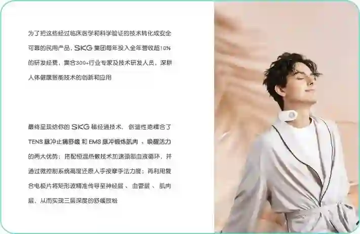 以头部品牌SKG为例,每年投入在研发上的预算就会占到全年营收超10%的比例。也因此率先创新性地糅合了TENS和EMS两种脉冲,加上对人体受力肌电信号的研究,突破了传统物理揉捏捶打等表层按摩的限制,深入实现对人体神经层、血管层、肌肉层的深度按摩和放松。形成了SKG具有优势的秘经通双脉冲按摩技术。