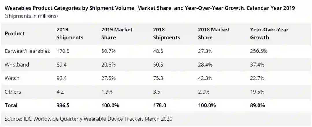 市场研究与咨询机构IDC公布的数据显示,2019年全球可穿戴硬件的出货量达到3.36亿台,比2018年猛增89%。