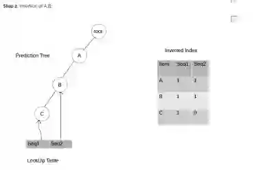 查看下一项,即B,看看B是否作为当前节点A的子节点存在。如果不存在,我们将B添加到A的子列表中,在带有seq1值的倒排索引中添加B的条目,然后将当前节点移动到B。
