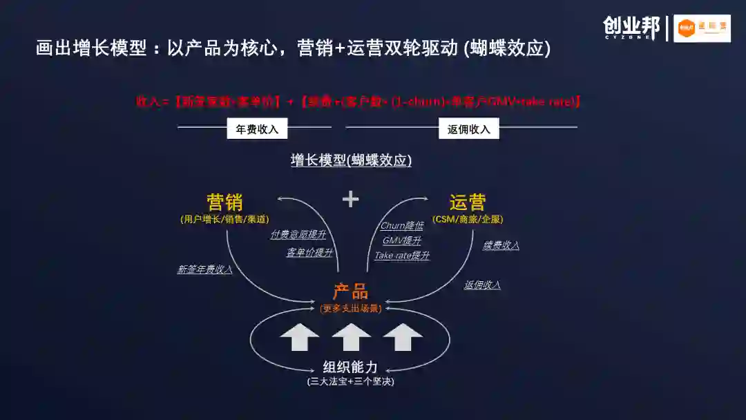 我们的核心优势是从产品出发,产品是公司前3年必须要抓的事,建议早期不要在销售上投太多钱。产品定好之后,左边是获客,右边是客户进来之后的运营服务,这两个体系要跟得上。最下面是组织能力,总结企业的三大法宝、三个坚决是什么。产品越好,ARR越高,客户为你付费的意愿越强。