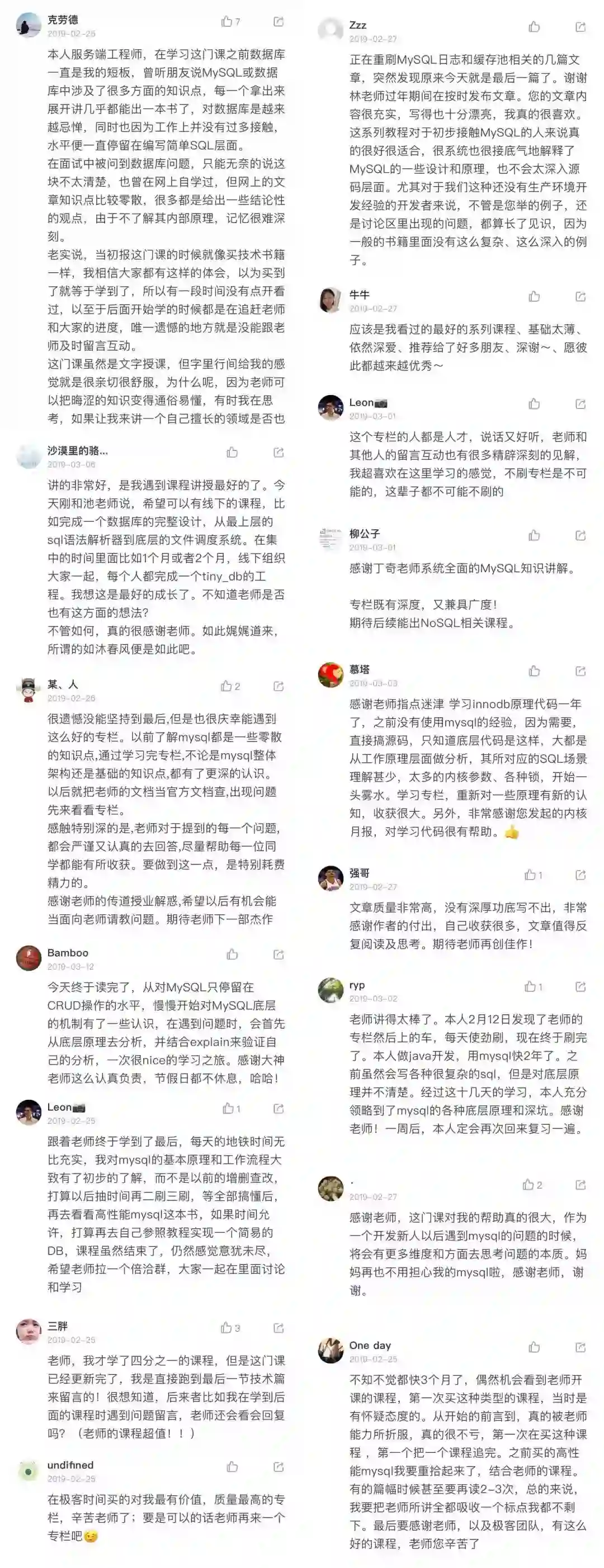 我也随便截了些读者评论,你从留言字数,就能看出《MySQL实战45讲》有多受欢迎了。