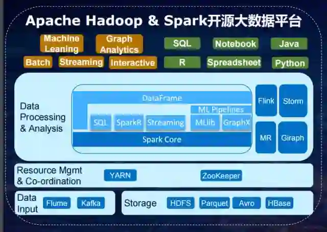 幸运的是,开源社区中的 Apache Hadoop/Spark 平台推动大数据分析进入了民主化时代。Spark 成为了业内进行大数据处理分析的主流计算框架,里面有非常多不同的组件提供各种各样的丰富的功能,从 SQL 的查询、流式的处理、机器学习、图像计算等等。