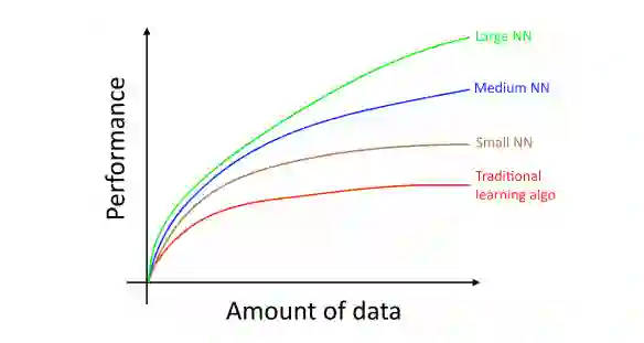 数据规模的扩展推动了深度学习的发展。如下图 Andrew Ng 在《Machine Learning Yearning》一书中展示的图。当达到一定的数量后,传统算法的性能不再随着数量而获得提升;但是,大中型神经网络计算的性能依然会持续提升,并且与传统算法的性能优势差距越来越大。