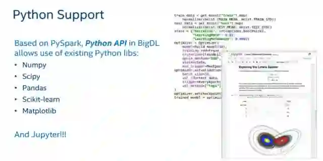 上图展示了对 Python 的支持和使用方法。基于 PySpare,开发者们可以通过 BigDL 中的 Python API 调用常见的 Python 库,如 Numpy、Scipy、Pandas、Scikit-learn、Matplotlib 等。