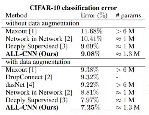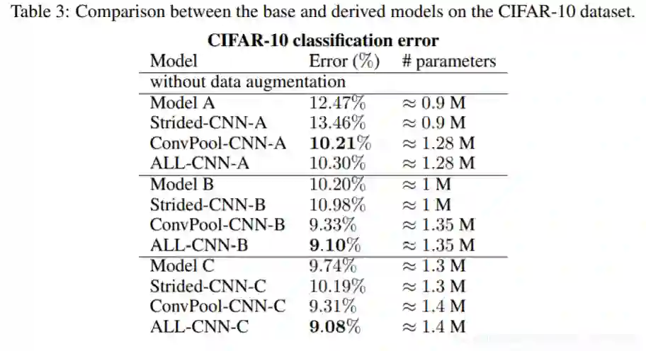 再B,C两组中, ALL-CNN都得到了最好的效果。而在A组,池化的效果比Strided的效果更好。「为了保证不是因为参数量增加而引起的,我们也对比了ALL-CNN-A」。事实证明池化操作是能提高网络性能的