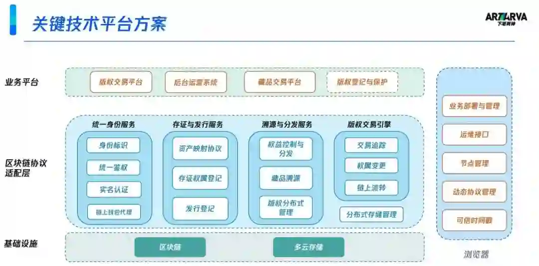 一个典型数字藏品交易平台的技术基础是底链,产品体现为 PC 端、H5 端和 App 端,业务功能包括藏品展示、抢购、藏品购买与支付、个人中心、后台管理和分享与通知。当然,实际上,产品形态丰富,玩法多样,比如定价购买、抢购、拍卖、盲盒和资产合成。链上功能则包括藏品铸造上链、区块链查询、交易上链和用户注册。从技术角度看,整个数字藏品交易平台按分层划分,上层是业务平台,包含版权交易平台、后台运营系统、藏品交易平台和版权登记与保护。底层基础设施主要依靠 TBaaS 长安链平台,以及其他基于多云的分布式存储的支撑。而中间则是纪震寰他们花费主要精力构建的区块链协议适配层,它分为统一身份服务、存证与发行服务、溯源与分发服务、版权交易引擎。
