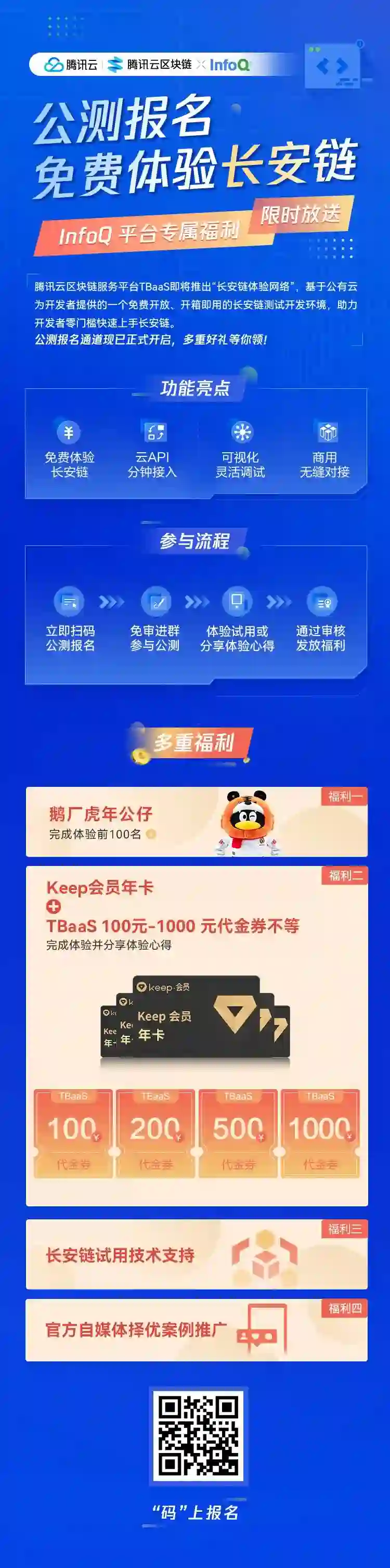 当前,TBaaS 长安链体验网络火热公测中。想更轻量试水长安链?想零门槛免费体验长安链?想开发自己的区块链应用?即可参与 TBaaS 长安链体验网络试用,还可获得惊喜福利:福利一,前 100 名完成试用,获得【鹅厂虎年公仔】;福利二,完成试用,并分享体验心得,可获【Keep 会员年卡】+【100-1000 元 TBaaS 代金券】。