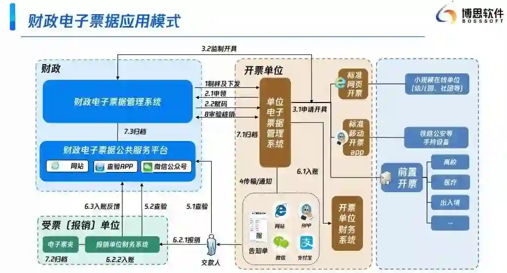 一般来说,财政电子票据业务流程由七个环节组成,分别是制样、赋码、开具、传 输、查验、入账、归档。