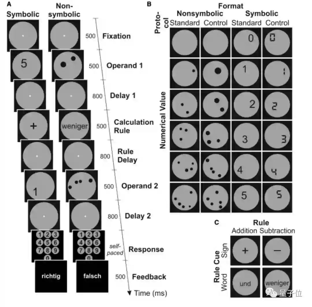 屏幕上依次显示数字(或圆点)和符号,之后志愿者就从数字键盘中选出计算结果,然后有电脑显示“正确”还是“错误”。