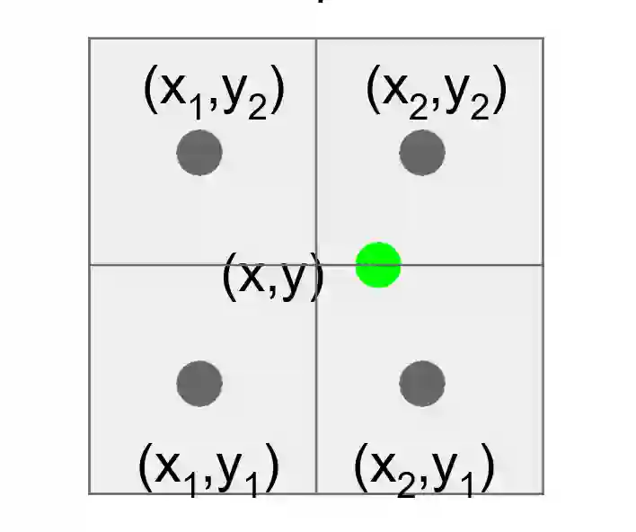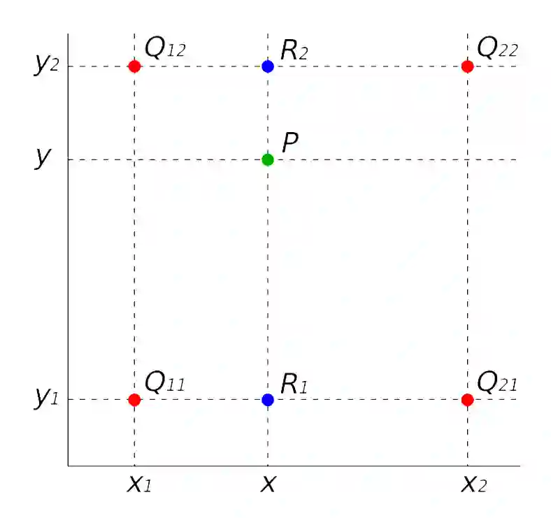 如图,已知求位置像素P的像素值, 已知相邻 的像素区域对应位置和像素值,其中坐下角像素区域标号为11,左上角像素区域标号为12,右下角像素区域标号为21,右上角像素区域标号为22。
