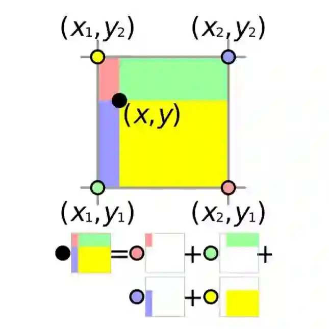 综上可以得到, 双线性插值本质上是目标像素所相邻的四个像素, 分别以像素对应的对角像素与目标像素的构成的矩形区域为权重,像素大小为值的加权和。