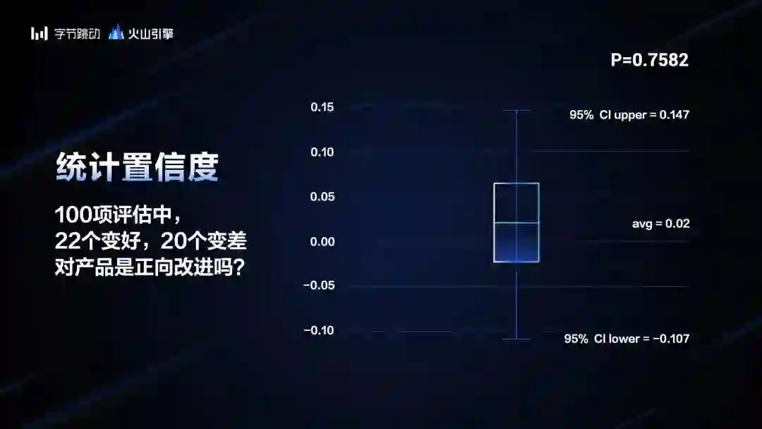 我这里写了一个置信度,P 值 = 0.75,这是什么意思?我们通常认为,P 值要小于 0.05,这个数据才是可信的,也就是 A 比 B 好。0.75 的意思是 “A 比 B 好” 碰巧出现的概率是 75%,这是不可信的。我们把这个箱型图画出来,它波动的范围如果按照 95% 的区间,从 - 0.1 一直到 0.147,是非常大的范围。把置信度画出来,发现这个实验完全不能说明 A 比 B 好。结论就是:这个实验不可信,没有显著性,完全不能从这个实验中得出 A 比 B 好的结论。