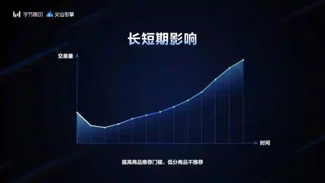 还有长短期的影响,这也是一个常见的问题。我举一个例子,比如说,我们对每个商品会有评价,现在兴趣电商比较热,电商的推荐主要会考虑它的评价,对于评价低的商品,我们会做一些控制和惩罚,让它的推荐少一些。如果加大惩罚力度,或者由不惩罚变成惩罚,交易量会怎么样变化?